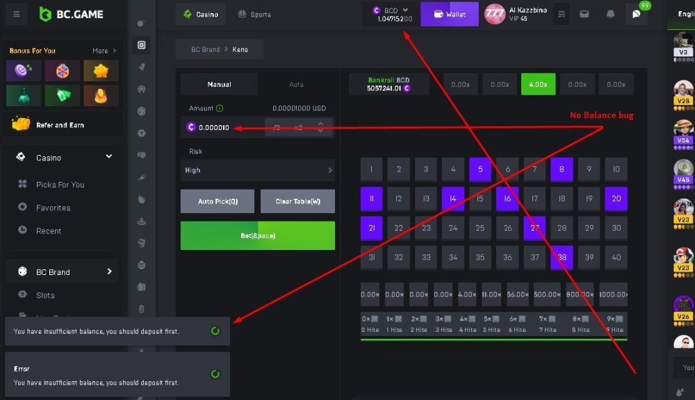3. UID: 1235924 bug: On originals does not recognise the balance when betting .....happens when I switch coin Ps. I love bc ... I will gamble here a long time from now ! thanks for your hard work !