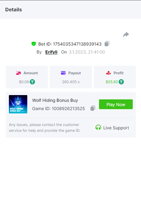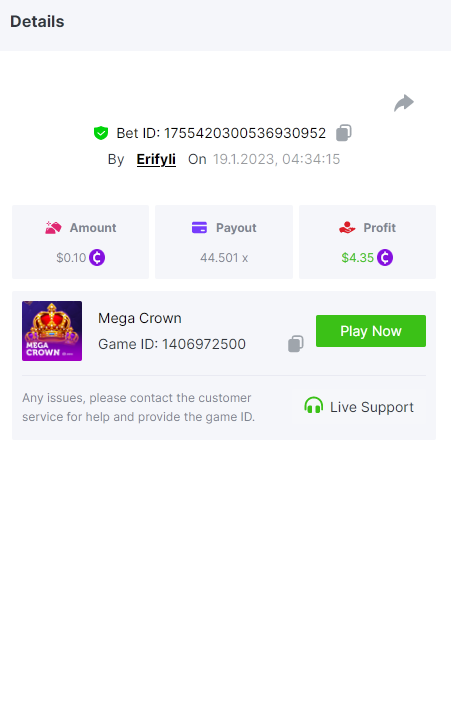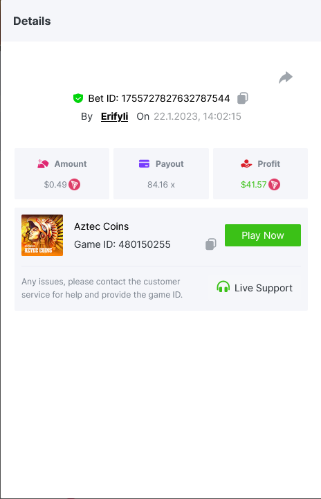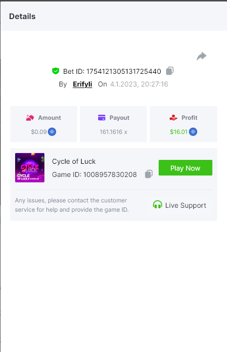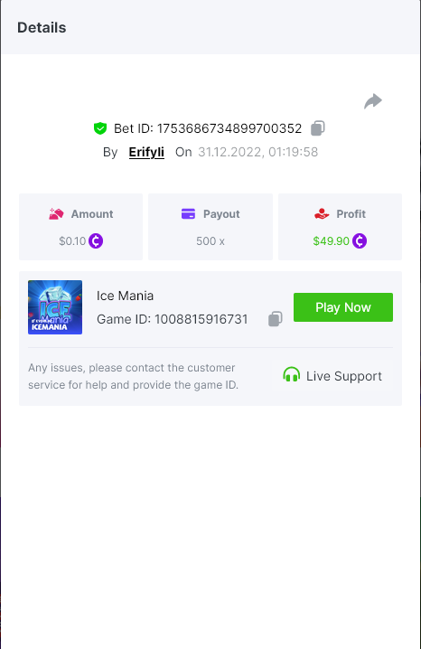 Bounty ? https://bc.game/#/sd/1123A7FXI98S9F The exact amount paid in the game was 50x but the multi shown is 0.05 higher than in reality. Not sure if this counts as bounty. https://bc.game/#/sd/1123L1X3SF7YTV https://bc.game/#/sd/111XF58ISYZR4J https://bc.game/#/sd/111X8MPZ776SYB https://bc.game/#/sd/111XAGX5V8YMMR https://bc.game/#/sd/1121WOEHI0AT5F https://bc.game/#/sd/111XKLL6U67THV