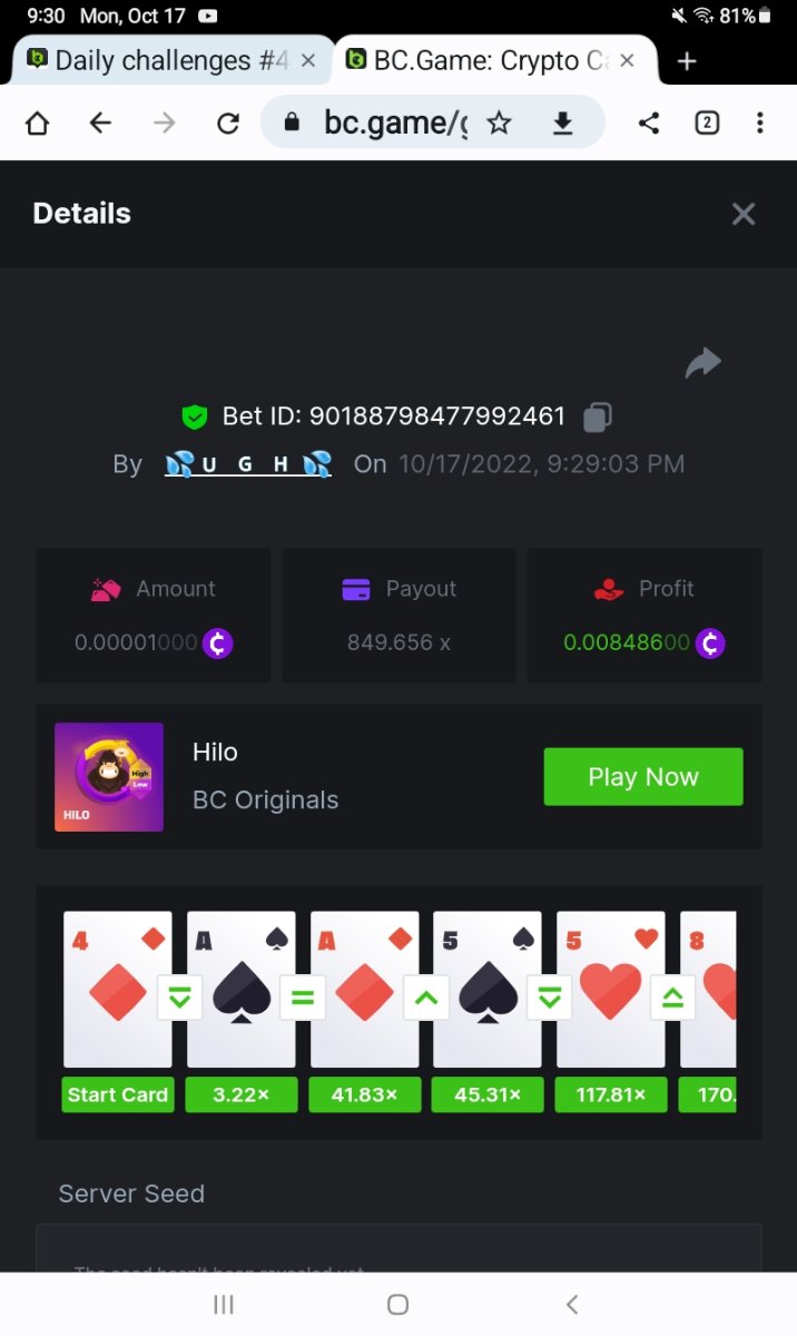 Black Tiger Posted October 18, 2022 Author Share Posted October 18, 2022 List of winner daily challenges #41 Chini 10407xBestNameOnBCgame. 9000xtrtlfast. 6379x 🎖Jake99. 4363x 🎖5th-10th place Bluryface. 2492x abolfazl75. 3115x PRPSOLUTIONwb. 1984x Bcgame1997. 2255x Kristalina. 1291x Mohamedfouad317.......1147x Send all the prizes for all winner Link to comment Share on other sites More sharing options...