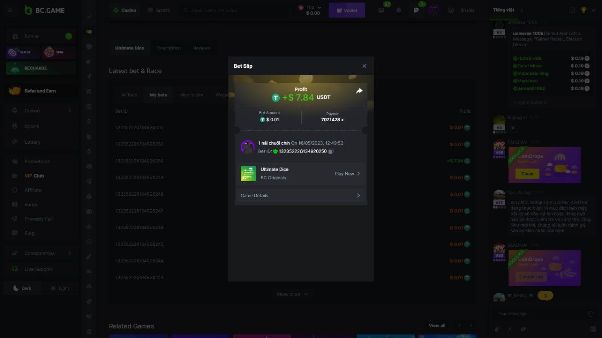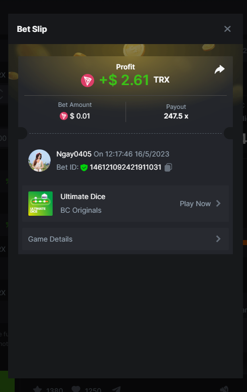 Maksypro Posted May 16, 2023 Share Posted May 16, 2023 Read Carefully Before Start To Hunt Daily Challenges #237 ULTIMATE DICE Hunt : Win the highest pay out Min Payout requirement 100x Min Level 4 οΈDuration Starting : Now End time : 23.59 UTC Time How to Join? Make screenshot + paste your bet link + UID or Profile link Any coin, with min bet 0.01 USD is allowed (jb/bb/bcl not allowed) Reward Prizes 1st Place.....$7 BCD 2nd Place.....$5 BCD 3rd Place.....$4 BCD 4th Place.....$3 BCD 5th Place.....$2 BCD π΅ Winners will be announcing next day after Roll Point! 1 Link to comment Share on other sites More sharing options...