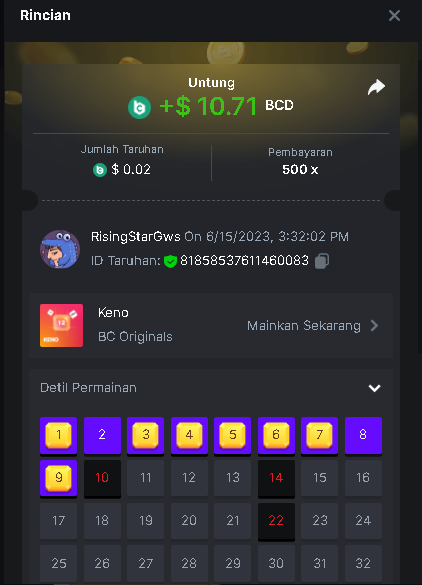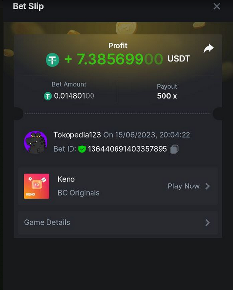 Maksypro Posted June 15, 2023 Share Posted June 15, 2023 Read Carefully Before Start To Hunt Daily Challenges #267 KENO Hunt : Win the highest multiplier Min Multiplier requirement 100x Min Level 4 ๏ธDuration Starting : Now End time : 23.59 UTC Time How to Join? Make screenshot + paste your bet link + UID or Profile link Any coin, with min bet 0.01 USD is allowed (jb/bb/bcl not allowed) Reward Prizes 1st Place.....$7 BCD 2nd Place.....$5 BCD 3rd Place.....$4 BCD 4th Place.....$3 BCD 5th Place.....$2 BCD ๐ต Winners will be announcing next day after Roll Point! Link to comment Share on other sites More sharing options...